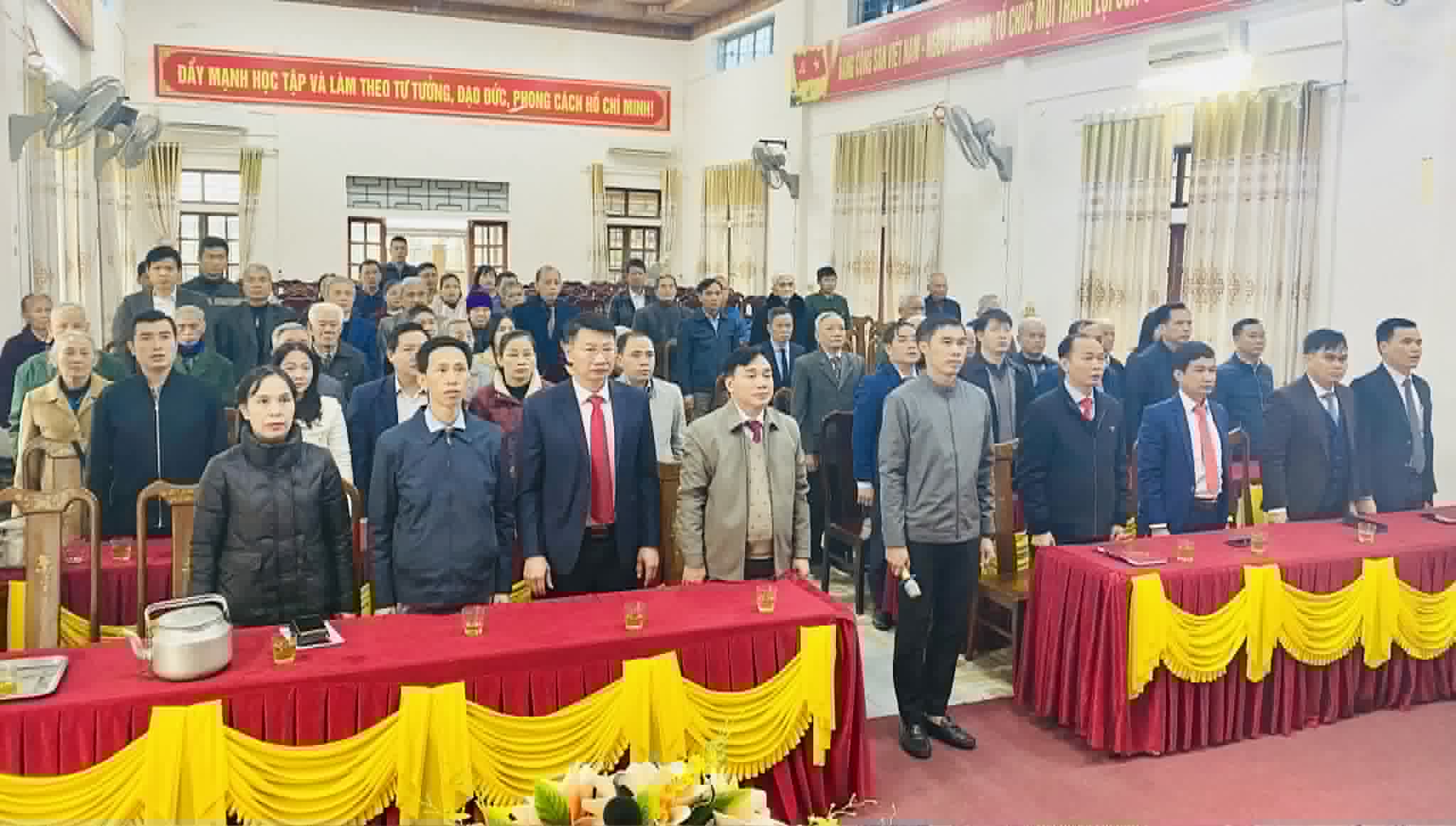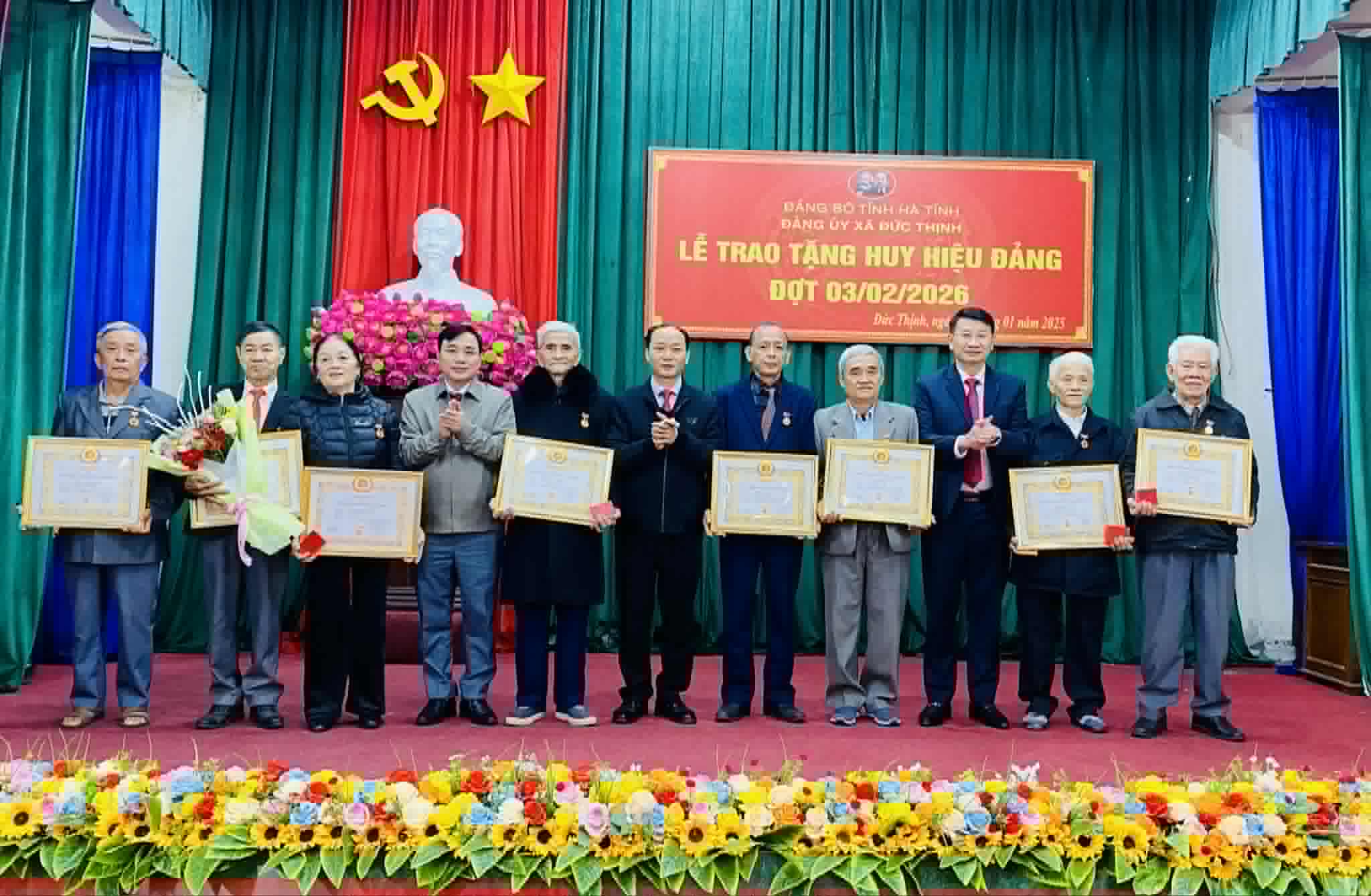 Tại buổi lễ, đại diện Đảng ủy xã đã công bố Quyết định số 138-QĐ/TU ngày 12/01/2026 của Ban Thường vụ Tỉnh ủy Hà Tĩnh về việc tặng và truy tặng Huy hiệu Đảng đợt 03/02/2026. Theo đó, toàn xã có 50 đảng viên được tặng và truy tặng Huy hiệu Đảng, trong đó: Huy hiệu Đảng 60 năm cho 12 đảng viên; Huy hiệu Đảng 55 năm cho 03 đảng viên; Huy hiệu Đảng 50 năm cho 03 đảng viên; Huy hiệu Đảng 45 năm cho 17 đảng viên; Huy hiệu Đảng 40 năm cho 05 đảng viên; Huy hiệu Đảng 30 năm cho 09 đảng viên; Truy tặng Huy hiệu Đảng 55 năm cho 01 đảng viên.