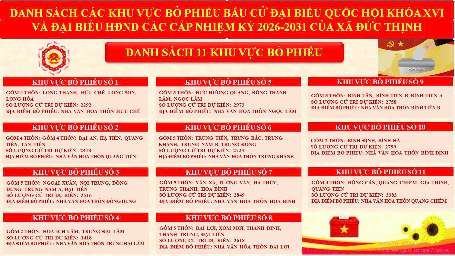 XÃ ĐỨC THỊNH ẤN ĐỊNH 11 KHU VỰC BỎ PHIẾU BẦU CỬ ĐẠI BIỂU QUỐC HỘI KHÓA XVI VÀ ĐẠI BIỂU HỘI ĐỒNG NHÂN DÂN CÁC CẤP NHIỆM KỲ 2026 - 2031Thúy Mùi10/01/2026A -A+Thúy Mùi10/01/2026A -A+Xã Đức Thịnh ấn định 11 khu vực bỏ phiếu bầu cử Đại biểu Quốc hội khóa XVI và Đại biểu HĐND các cấp nhiệm kỳ 2026 - 2031. Bầu cử Đại biểu Quốc hội khóa XVI và Đại biểu HĐND các cấp nhiệm kỳ 2026-2031 sẽ diễn ra vào Chủ nhật, ngày 15/3/2026./. File đính kèmảnh 11 khu vực bỏ phiếu.jpg